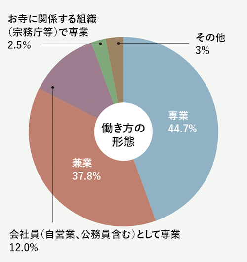 アンケートに回答した僧侶の「働き方の形態」を見てみると、現在自坊に専業している僧侶は全体の44.7%、自坊の仕事をしながら他にも仕事を持つ兼業僧侶は37.8%、会社員(自営業、公務員含む)として専業している僧侶は12%、お寺に関係する組織(宗務庁等)で専業している僧侶は2.5%という回答でした(その他3%)。