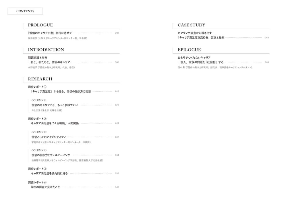 今回は3点についてご紹介しましたが、ほかにもデータやヒアリングインタビューから見えてきた、仮説や提案などを記載しています。また、多様なゲストによる寄稿も見どころです。大阪大学キャリアセンター副センター長・家島明彦氏、武蔵野大学ウェルビーイング学部長、慶應義塾大学名誉教授・前野隆司氏、多様なキャリアを重ねる僧侶の井上広法氏に、それぞれの立場から「僧侶のキャリア」について言及いただいていますので、ぜひ一読ください。